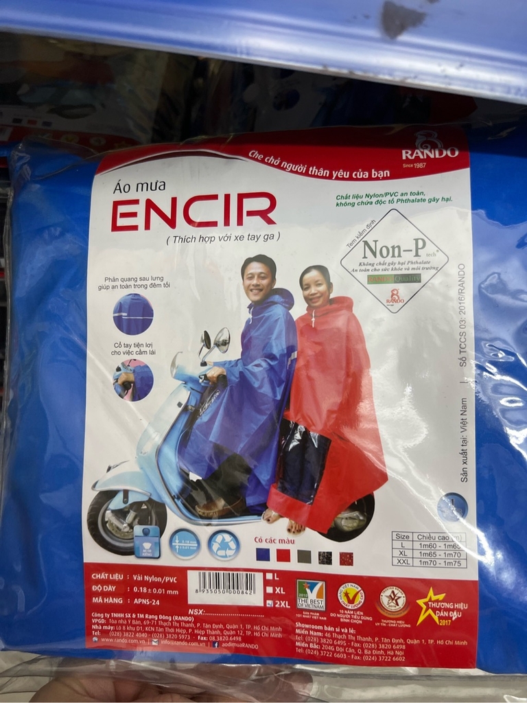 Áo mưa ENCIR – Áo đi mưa một người với thiết kế bít sườn giúp người di chuyển trong mưa được che kín toàn thân. Mặt trước áo kết hợp màn kiếng trong suốt giúp an toàn hơn khi lưu thông vào buổi tối.